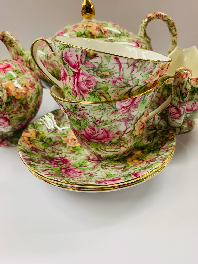 Large Teapot, milk jug, sugar bowl and 2 cups and saucers