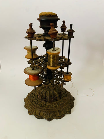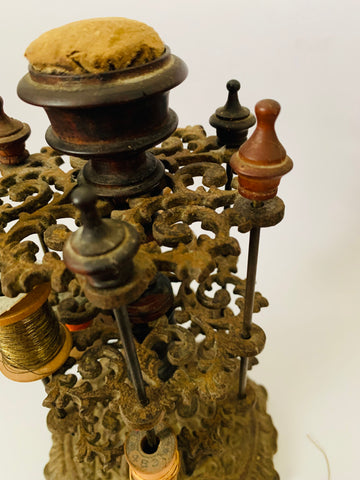 Rare Victorian cast iron ornate cotton reel holder and pin cushion