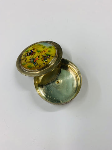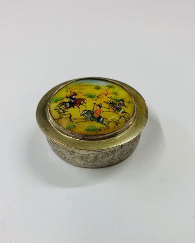 Silver plated pill box with Mongolian fighting scene on the lid