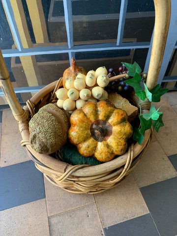 Basket has 2 loaves of bread, grapes, pumpkin, squash and another green vegetable with some leaves
