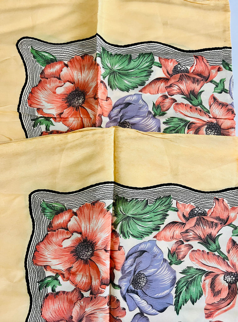 Silky Scarf with yellow edges and purple and red flowers