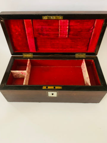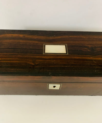 Mother of Pearl inlay on the top and around the key hole. No key but does lock if you tip the box sideways and vice versa