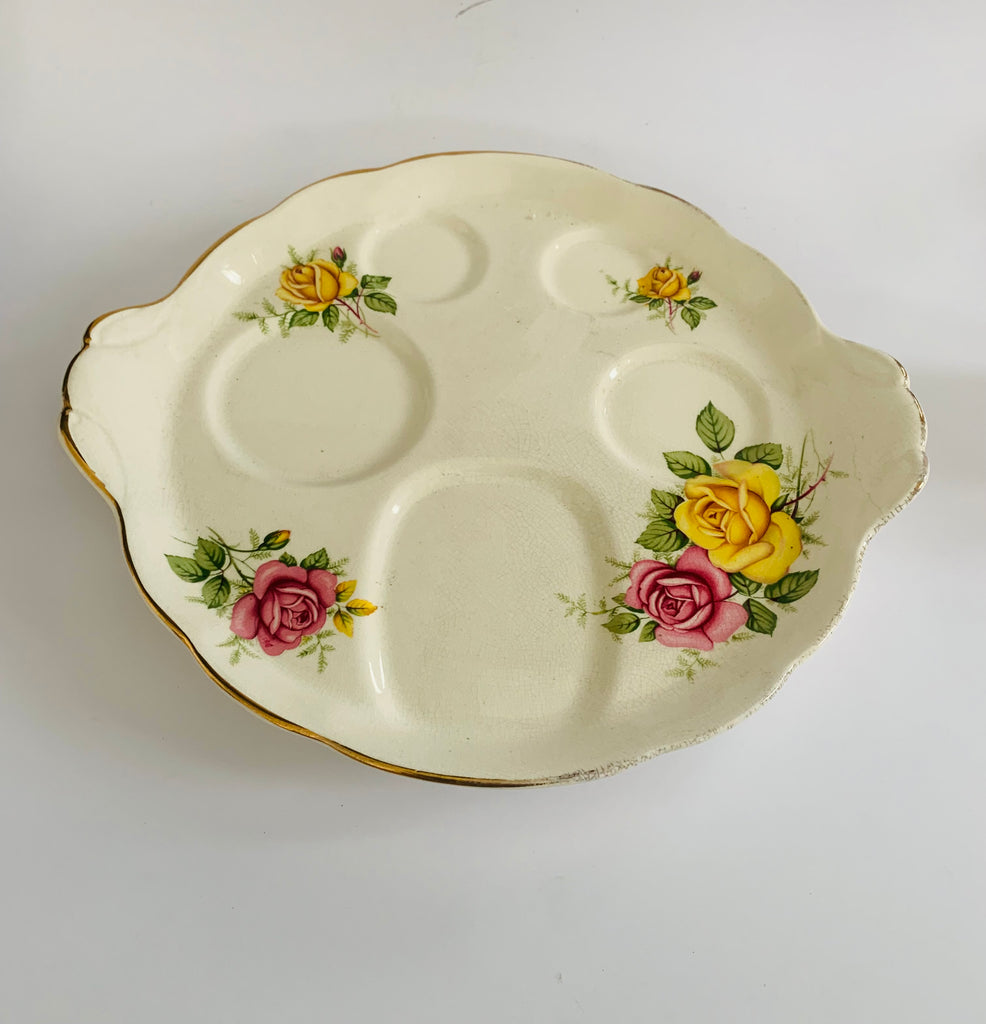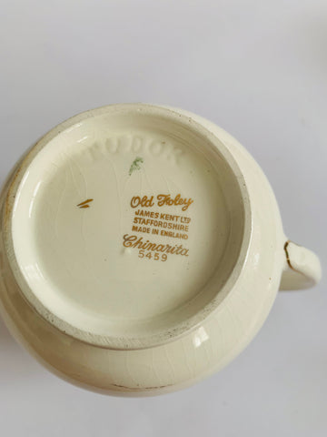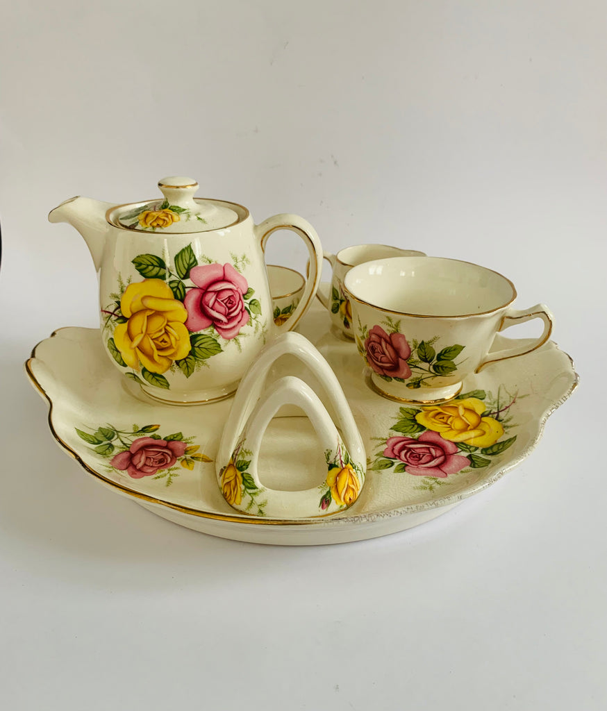 Tray, teapot, cup, milk jug, sugar bowl and toast rack.