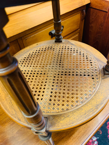 Beautiful marquetry inlay wood. Turned legs with cane style lower level