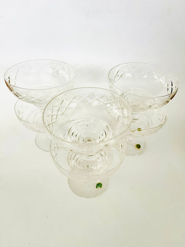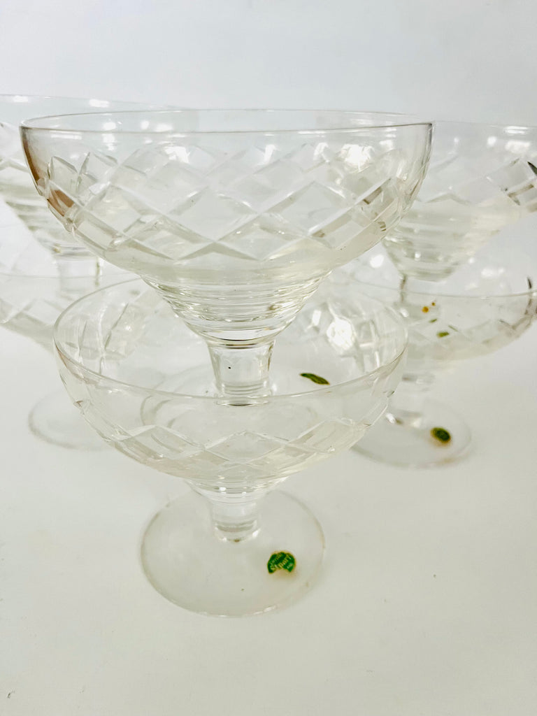Stuart Crystal Set of Six Steamed Champagne saucersCross Hatched pattern with short stem . 9cm tall x 10.5cm diameter top